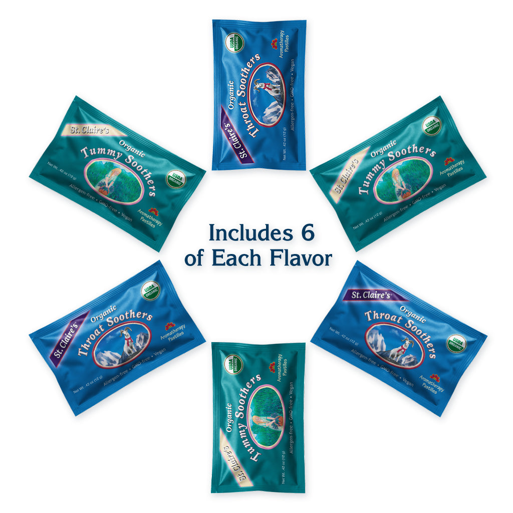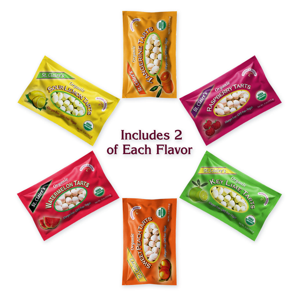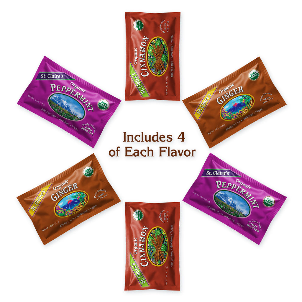 Discover your favorite flavors in St. Claire’s Organic Pocket Friendly Pouches – 12 Pack. Each pouch contains our certified organic, Allergen-free, Vegan, candies or pastilles—ideal for on-the-go snacking, gift sets, sampling, or sharing. From Sour Lemon Tarts and Watermelon Tarts to our icy-fresh Peppermint, soothing Ginger, and herbal Tummy Soothers, this collection offers a wide variety of naturally delicious treats crafted with low-glycemic organic molasses granules and pure essential oils.